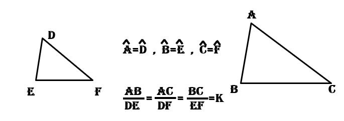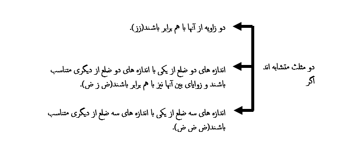 دو مثلث متشابه اند اگر و تنها اگر زاویه های یکی، برابر با زاویه های دیگری باشند و در نتیجه، نسبت اضلاع متناظر در آنها مقداری ثابت به نام نسبت تشابه باشد.