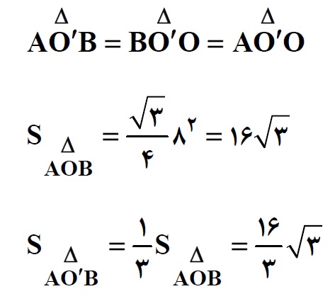 از طرفی هر یک از خطهای AC و BF مثلث AOB را به دو قسمت برابر تقسیم میکنند. هر یک از این خطها، عمودمنصف مثلث متساویالاضلاع AOB هستند. به این ترتیب در مثلث AOB شش مثلث برابر تشکیل خواهد شد که یکی از آنها همان قسمت هاشورخورده شکل سوال است.پس داریم: