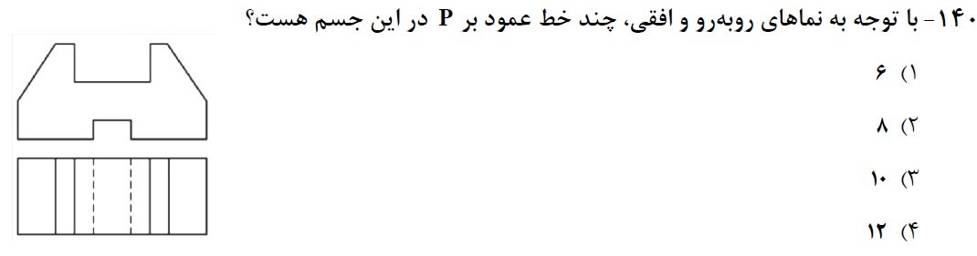 همانطور که میدانید، منظور از صفحه P، صفحه افقی تصویر است. خطی که عمود بر این صفحه باشد، خط قائم نامیده میشود. در دو نمای داده شده، مشخص است که این جسم دارای تقارن است و نمای روبهرو و پشت آن کاملا یکسان است و سطح روبهرو عمود بر صفحه P میباشد. در سطح روبهرو شش خط عمودی (خط قائم) مشاهده میشود. با توجه به مشابه بودن سطح روبهرو با پشت آن، در مجموع 12 خط قائم خواهیم داشت.