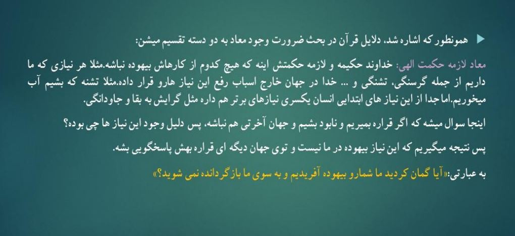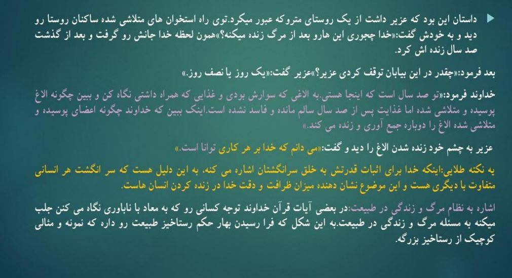1) ضرورت-لازمه حکمت 2) امکان-نمونه هایی از زنده شدن مردگان