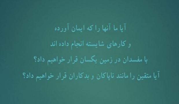 🔵 یکی از ویژگی های خداوند عدل هست.خدا عادله و فرد نیکوکار رو هرگز با فرد بدکار برابر و یکسان قرار نمیده.پس طبق قولی که خدا به ما داده حق هیچ کسی ضایع نمیشه و هرکس به اون چیزی که حقش رو داره میرسه.
