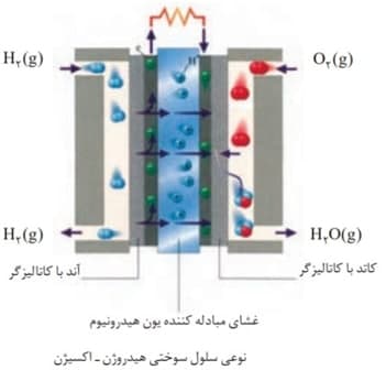 شکل زیر، رایج ترین سلول سوختی، یعنی سلول سوختی هیدروژن – اکسیژن را نشان می دهد.