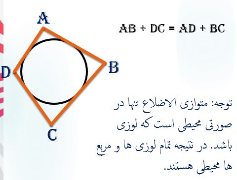 یک چهار ضلعی محیطی است اگر و تنها اگر مجموع طول های دو ضلع مقابل، برابر با مجموع طول های دو ضلع دیگر باشد.