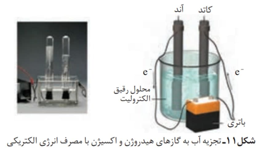 با یکسان گرفتن تعداد الکترون ها در دو نیم واکنش مشاهده می شود که میزان هیدروژن تولیدی در کاتد دو برابر اکسیژن تولید در آند است( اختلاف ارتفاع هوا در دو لوله)