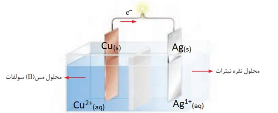 2-الکترون ها از طریق سیم از محلول مس (II) سولفات به محلول نقره نیترات می روند.