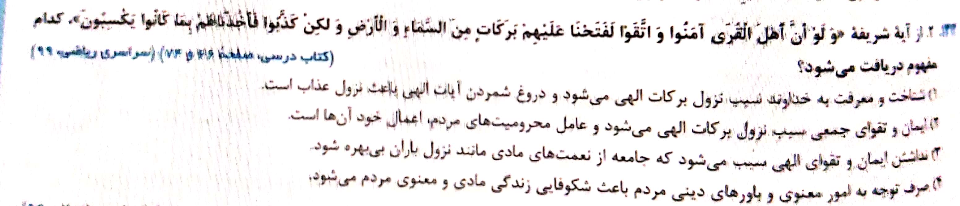 مفهوم این آیه اشاره به این موضوع دارد که کسانی که ایمان آورده و تقوا پیشه کنند شامل برکات آسمانی و زمینی خداوند خواهند شد و کسانی که تکذیب کنند به کیفر کرده خود دچار می شوند حال در گزینه ها دقت کنید در گزینه 1 عامل برکات شناخت و معرفت خدا اعلام شده که طبق آیه صحیح نیست ، در گزینه 3 صرفا به نعمات مادی اشاره شده و معنای کاملی از آیه را نمی رساند و درگزینه 4 صرفا امور معنوی عامل برکات معرفی شده بنابراین گزینه 2 کامل ترین مورد است.