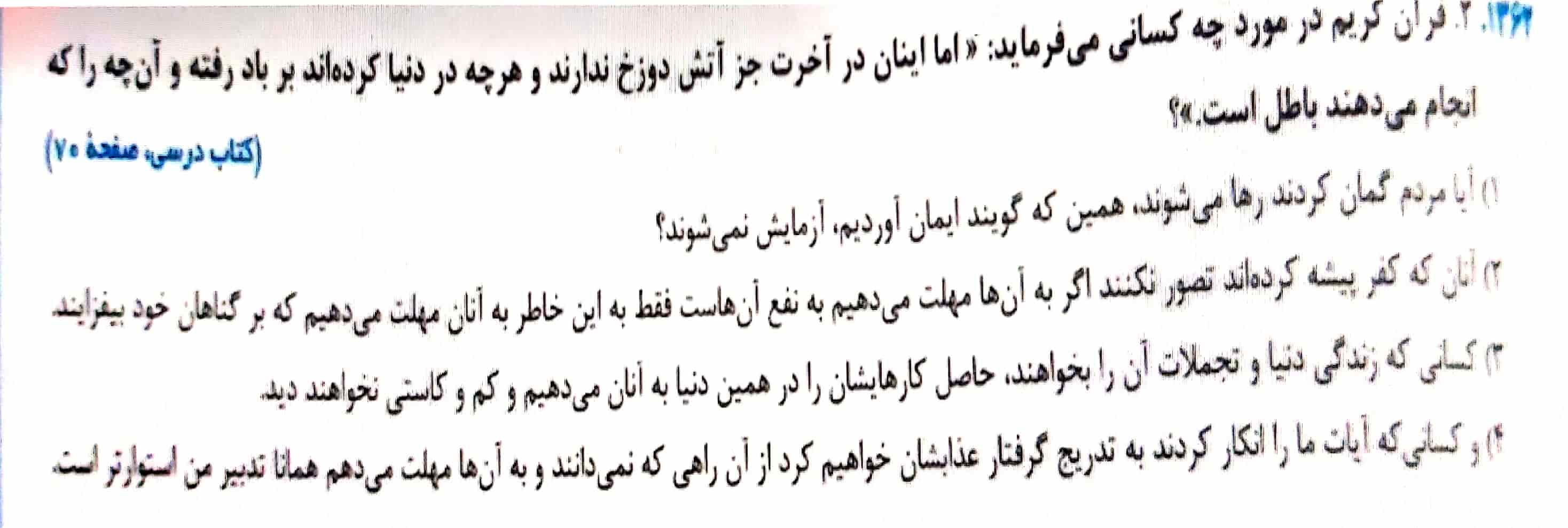 اگر در آیات 15 و 16 سوره هود در صفحه 70کتاب درسی دقت کنید خواهید دید که گفته شده این عبارت در مورد افرادی گفته شده زندگی دنیا و تجملات آن را بخواهند و حاصل کار این افراد در همین دنیا به آنها داده خواهد شد و کم و کاستی در دنیا نخواهند دید .
