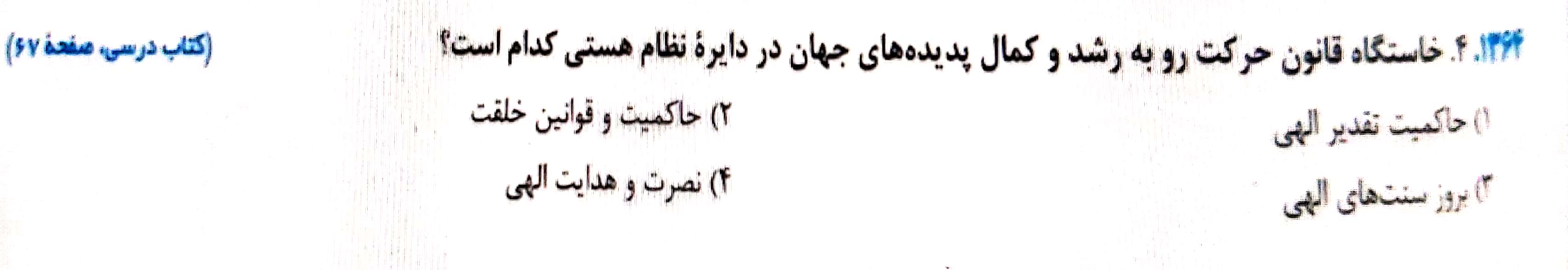 اگر در متن کتاب درسی دقت کنید نوشته شده بر اساس تقدیر الهی ،جهان خلقت دارای نظام بندیست پدیده های جهان در دایره قوانین خاصی حرکت می کنند و مسیر تکامل خود را می پیمانند و یا بر یکدیگر تاثیر می گذارند .با توجه به این جمله پاسخ سوال گزینه 1 خواهد بود .