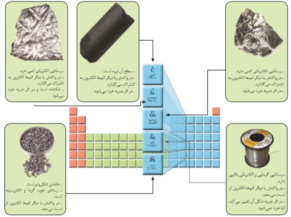 - خواص فیزیکی آن ها بیش تر به فلزها شبیه است در حالی که رفتار شیمیایی آن ها همانند نافلزهاست.