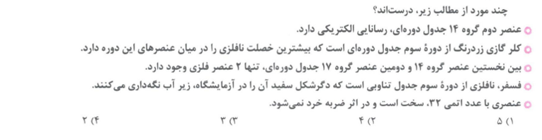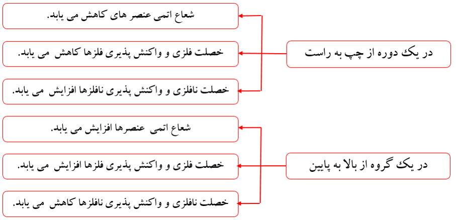 نکته: خصلت فلزی در یک دوره از چپ به راست، کاهش و خصلت نافلزی در یک دوره از چپ به راست، افزایش می یابد.