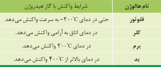 توجه: هر چه یک نافلز، تمایل بیش تری برای گرفتن الکترون داشته باشد، واکنش پذیری و خصلت نافلزی بیش تری دارد.