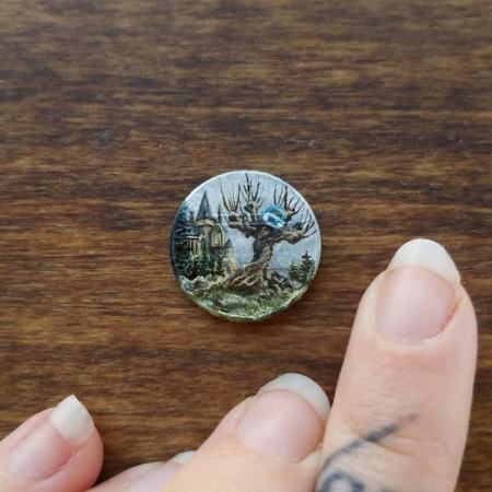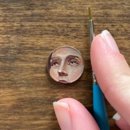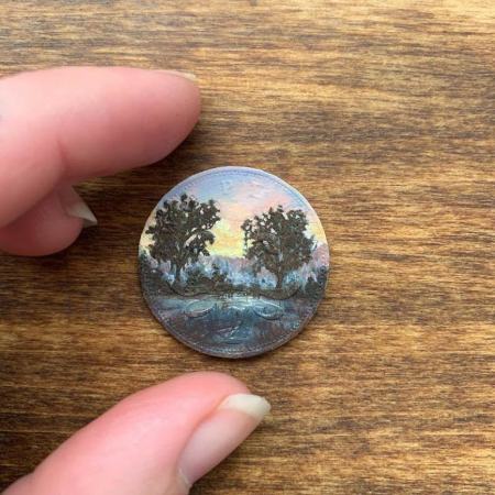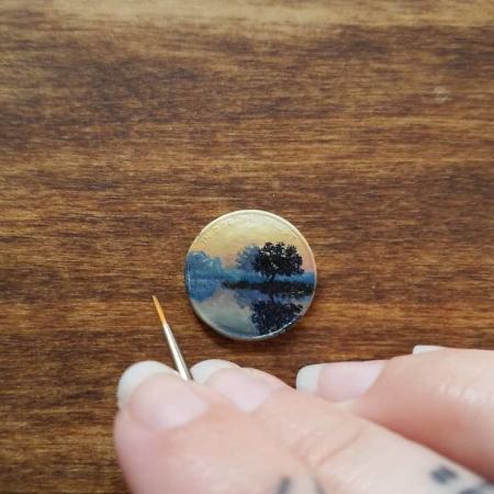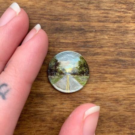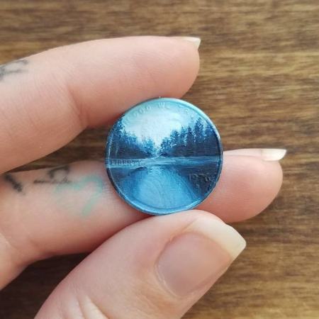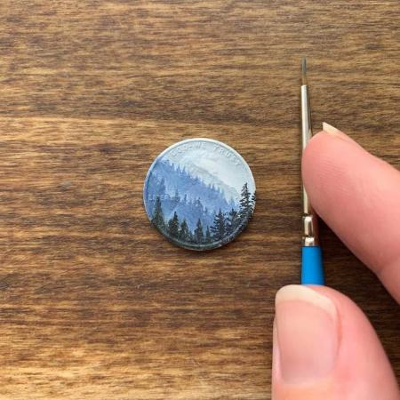 او از سکه و سطوح مسی کوچک به عنوان بوم نقاشی استفاده میکند. سکه یک پنی و آنهایی که قبل از سال ۱۹۸۱ ضرب شده بودند، ترجیح او هستند.