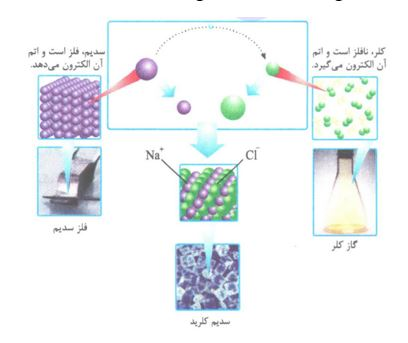 مثال: هرگاه اتم های سدیم و کلر کنار یکدیگر قرار گیرند، اتم سدیم یا از دست دادن یک الکترون به یون سدیم (+Na) و اتم کلر با گرفتن یک الکترون به یون کلرید (-Cl) تبدیل و در این واکنش، ترکیب یونی سدیم کلرید (نمک خوراکی) تشکیل می شود.