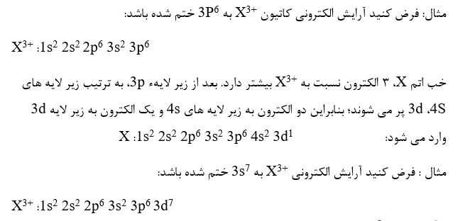 * اگر در یک آرایش الکترونی، زیرلایهء 3d وجود داشته باشد ولی زیرلایهء 4s وجود نداشته باشد، آن آرایش الکترونی فقط می تواند، مربوط به یک یون مثبت (کاتیون) باشد.