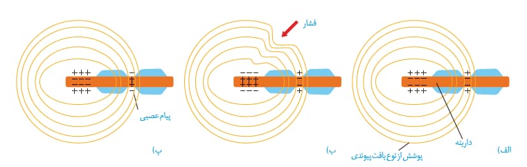 این قسمت، ساختار گیرنده فشار رو به ما نشون میده. همونطور که گفتیم گیرنده فشار بخشی از یک نورون هست که مطابق شکل، اون بخش دندریت یک نورون حسی هستش. در اطراف این دندریت، یه پوشش چند لایه از جنس بافت پیوندی ( حواستون باشه غلاف میلین نیستا!) قرار گرفته. غلاف میلین نیز در زیر این پوشش قرار گرفته است.