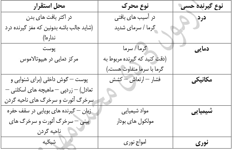 *دقت کنید که گیرنده های دمایی در واقع دو دسته هستند. گیرنده های سرما فقط به کاهش دما و گیرنده های گرما به افزایش دما حساس می باشند.