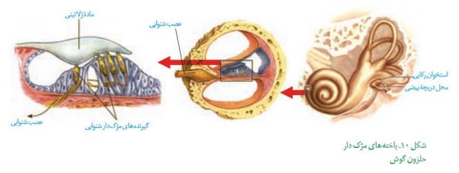 در بخش حلزونی، مایعی وجود داره که لرزش دریچه بیضی، باعث لرزشش میشه. در بخش حلزونی، یاخته های مژکداری وجود داره که مژک هاشون ( نه کل یاخته ها) با پوشش ژلاتینی در تماس هستن. این یاخته های مژکدار، گیرنده های مکانیکی هستن که با لرزش مایع درون بخش حلزونی، مژک هاشون خم میشه. در نتیجه خم شدن مژک ها، کانال های یونی غشا باز میشن (یون های سدیم به درون یاخته سرریز میشن) و در نتیجه یاخته ها تحریک میشن. در نهایت، بخش شنوایی عصب گوش پیام عصبی رو به مغز میبره....