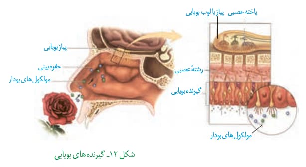 حس بویایی: گیرنده های بویایی در سقف حفره بویایی قرار دارن. گیرنده های بویایی نوعی نورون هستن که دندریت هاشون (هر نورون یه دندریت داره) مژکدار هست. مولکول های بودار هوای تنفسی که وارد بینی شدن، این یاخته ها رو تحریک میکنن. در نتیجه تحریک، آکسون این یاخته ها، پیام های بویایی رو به لوب های بویایی مغز میبرن. پیام بویایی اخرش به قشرمخ ارسال میشه و پردازش میشه و ما بوی مولکول های بودار رو حس می کنیم...