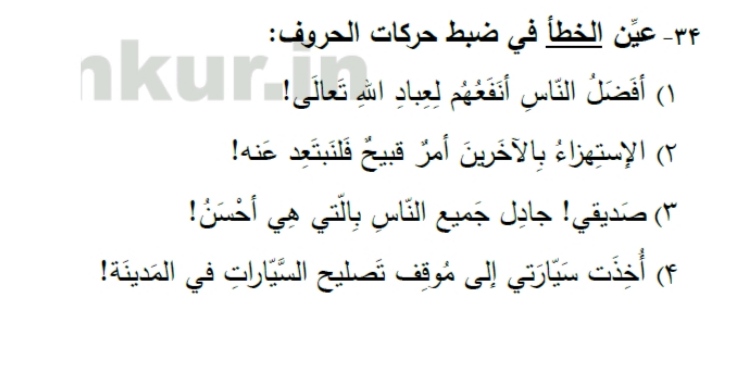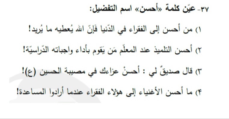 اعراب اسم تفضیل "اَفضَل" در گزینه یک و "احسن" در گزینه دو درست هستند. اما اعراب اسم مکان "موقف" در گزینه چهار غلطه چون باید بر وزن مَفعَل باشه یعنی مَوقف نه مُوقف!