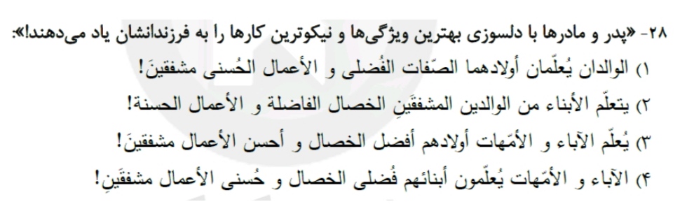 دلایل دیگری هم برای رد گزینه ها وجود دارد مثل مشفقینَ که در گزینه 4 با اعراب غلط آمده و در گزیته 2 به صورت صفت آمده و والدان در گزینه یک که ترجمه ناقصی برای پدر و مادرها است. اما این دلایل صرفا به عنوان فاکتور اطمینان شما هستند تا مطمئن شوید از درستی گزینه ی انتخابی و موضوع اصلی همان اسم تفضیل است.