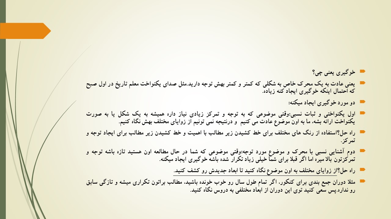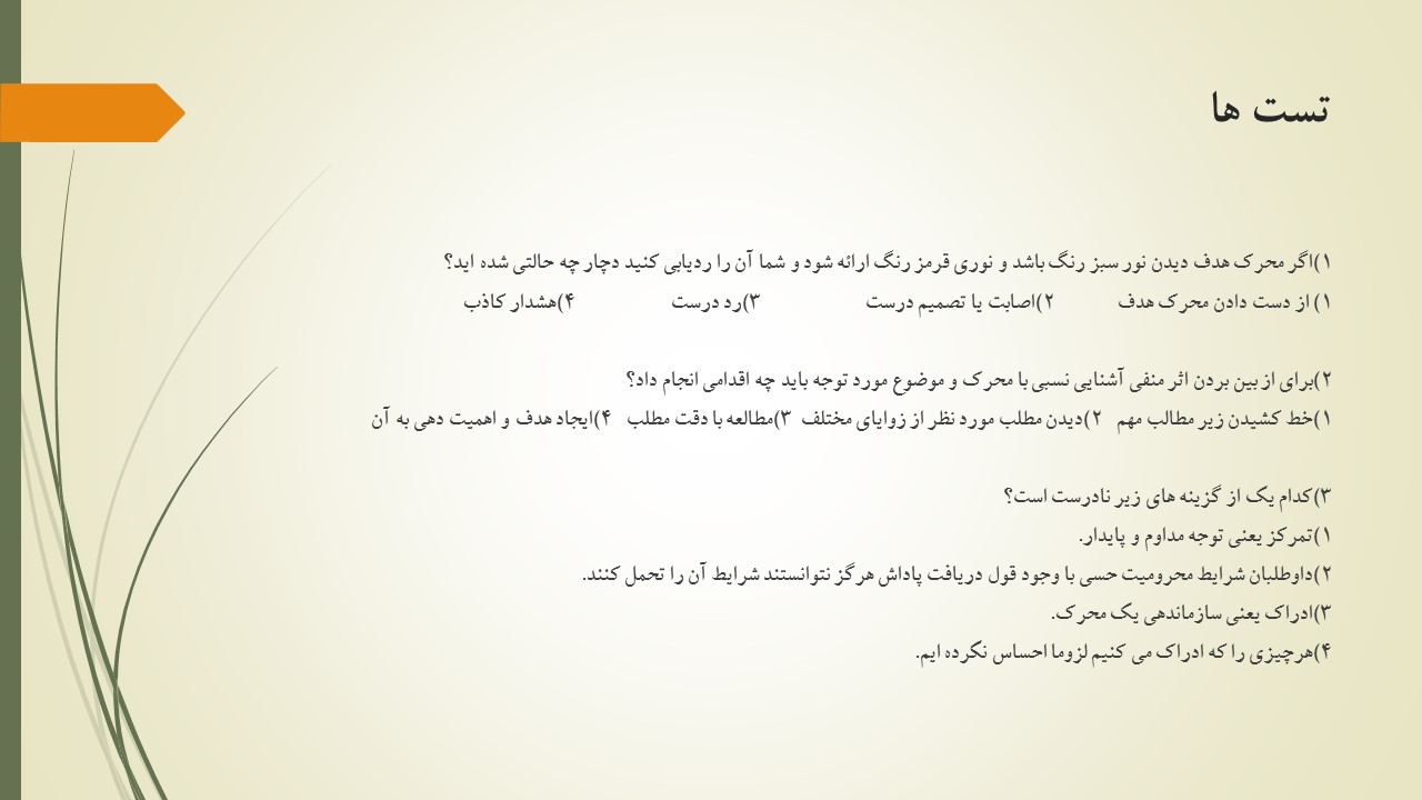 مورد دوم درگیری و انگیختگی ذهنی:دو عامل اثرگذار بر انگیختگی یا به اصطلاح درگیر شدن ذهن ما با یک موضوع یکی عوامل فیزیولوژیکی و دیگری عوامل روانی هست0حالا این موارد باعث چه اتفاقی میشن؟باعث میشن تو یک فرد که تازه 2 صفحه از کتاب روان شناسی رو شروع به خوندن کرده بگه:خسته شدم. و در دوستش باعث شده بگه که: من تازه راه افتادم و حالا دارم متوجه مطالب میشم.دو مورد باعث کارکرد خوب و مناسب فیزیولوژی بدن ما میشه:مثل تغذیه مناسب و تامین نیازهای زیستی .یک عامل روانی هم روی انگیختگی ذهنی ما موثره که ایجاد هدف و اهمیت دادن به اون هست.پس به عنوان یه دانش آموز اگر بخوایم که ذهنمون با مطالبی که مطالعه می کنیم کاملا درگیر بشه باید علاوه بر اینکه از مطالعمون هدف داریم و بهش اهمیت میدیم، به تغذیه و تامین نیازهای زندگیمون هم توجه کنیم.