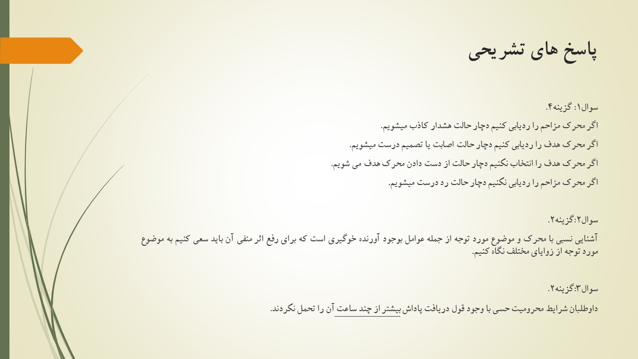 اگر محرک مزاحم مثلا صدای بوق ارائه بشه و شما دکمه رو به این دلیل فشار ندی که صدای تیک تیک ساعت رو نشنیدی تصمیم شما از نوع رد درست هست. یعنی شما محرک مزاحم رو ردیابی نکردید.
