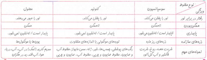 کلوئیدها و سوسپانسیو نها جزء مخلوطهای ناهمگن هستند. ذره های سازنده این مخلوط ها، درشت تر از محلول ها است، به همین دلیل برخلاف محلولها نور را پخش می کنند.