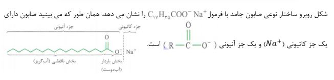 1- بخش زنجیر هیدروکربنی که اب گریز است و در نتیچه چربی دوست است و سر ناقطبی صابون را تشکیل می دهد.