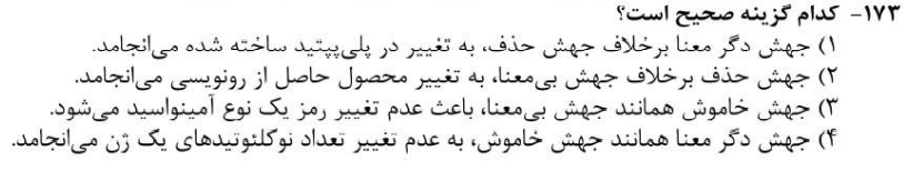 گزینة 1 )جهش حذف نیز می تواند منجر به تغییر در پلی پتتید ساخته شده ، شود . ( اگر می گفت برخلاف جهش خاموش ، این گزینه صحیح بود . )