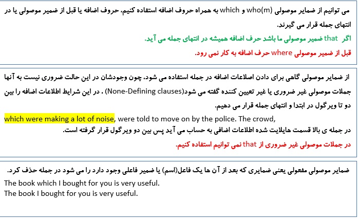 Which, who, where و غیره اگر در جمله استفاده شوند از تکرار یک اسم جلوگیری می کند، این کلمات ضمایر موصولی نامیده می شوند که به حالت های فاعلی، مفعولی و ملکی به کار می روند، این ضمایر در زبان فارسی (که) ترجمه می شوند.