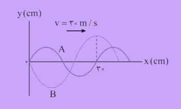 5- شکل زیر عکس لحظه ای دو موج را در لحظه ی معینی نشان می دهد که در یک محیط در حال انتشارند چشمه موج A در هر20 ثانیه چند نوسان کامل بیشتر از چشمه موج B انجام می دهد؟