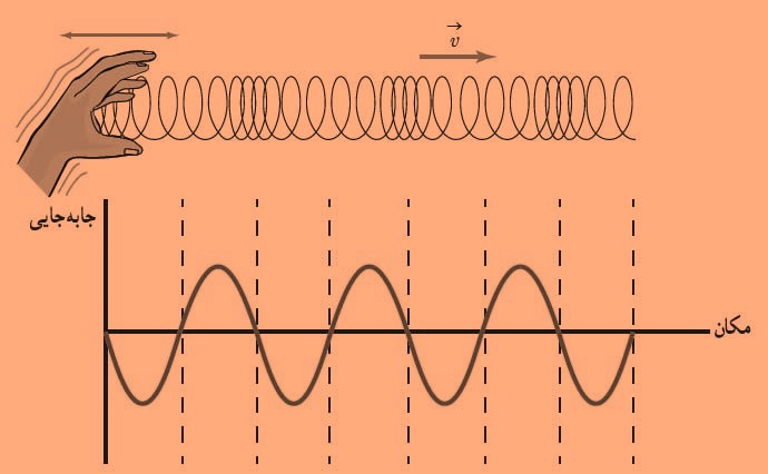 •در انتشار موج طولی در یک فنر بلند کشیده شده، ناحیه های جمع شدگی و باز شدگی به طور متناوب در طول فنر ظاهر می شوند. در یک لحظه از زمان، در مکان هایی که بیشترین جمع شدگی یا باز شدگی حلقه ها رخ می دهد، جابجایی هر جزء فنر از وضعیت تعادل صفر است. در وسط فاصله بین یک جمع شدگی بیشینه و یک باز شدگی بیشینه مجاور هم، اندازه جابجایی هر جزء فنر از وضعیت تعادل، بیشینه است. به این ترتیب نمودار جابجایی-مکان را رسم کرد. با استفاده از چنین نموداری، برای یک موج طولی نیز می توانیم همان مشخصه های موج عرضی را تعریف می کنیم. مثلا طول موج برابر با فاصله بین دو تراکم (یا جمع شدگی) یا دو انبساط (یا باز شدگی فنر)متوالی است. همچنین دامنه موج طولی برابر با بیشینه جابجایی از مکان تعادل است.