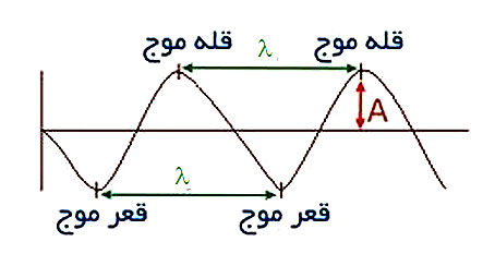 دامنه A : •بیشینه فاصله یک ذره از مکان تعادل، دامنه موج نامیده می شود که همان فاصله قله یا دره نسبت به سطح آرام یا ساکن است.