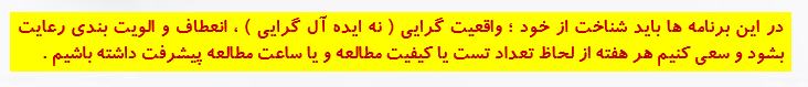 برنامه ی هفتگی : بدانید چه اتفاقات مهمی در این هفته می افتد و قرار است درس ها را تا چه مبحثی مطالعه کنید ( مثلا یک امتحان مهم یا اتفاق خارج از برنامه ای که ممکن است شما را از برنامه عقب بیاندازد و نیاز به برنامه ی جبرانی داشته باشید )