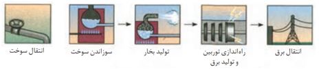 تبدیل انرژی شیمیایی موجود در یک سوخت به انرژی الکتریکی قابل استفاده در یک نیروگاه حرارتی، شامل 5 مرحله ی زیر است: