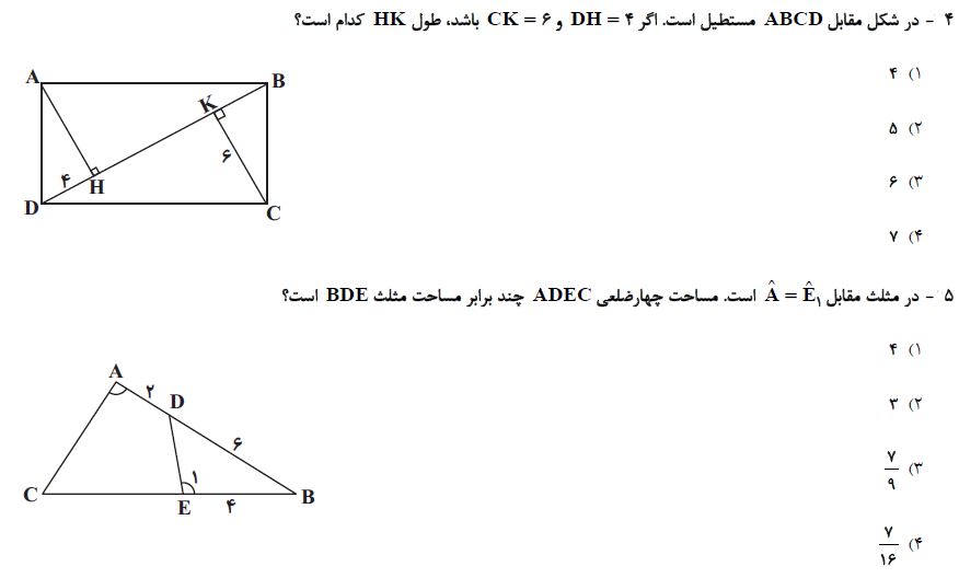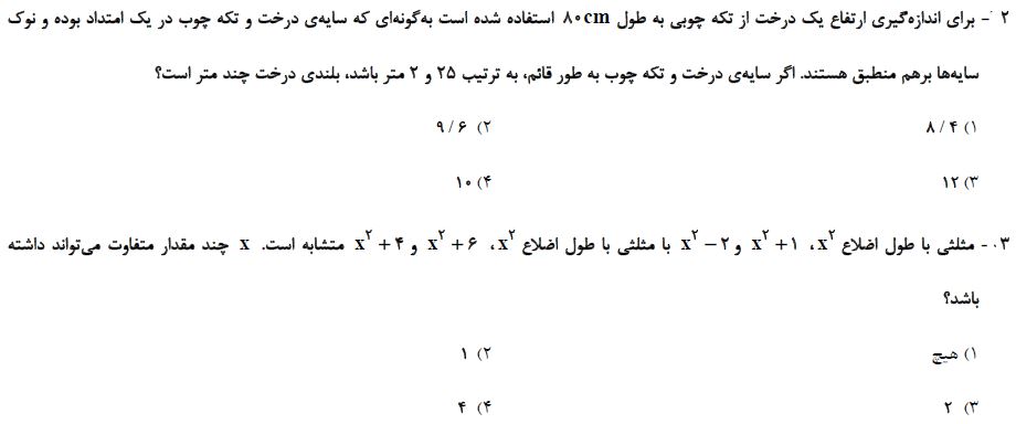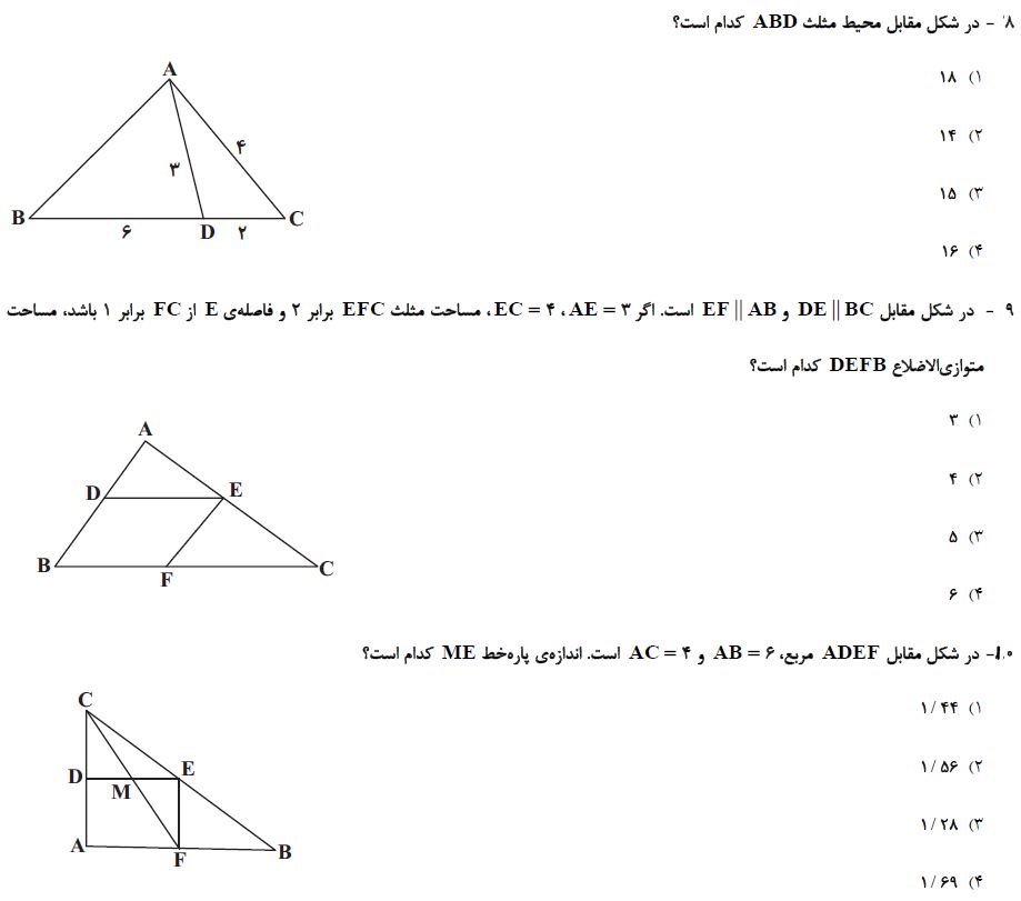 10 سوال هندسه دهم که در ادامه برای شما قرار دادیم، جمع بندی مباحث آزمون 23 دی بوده و برای آمادگی بیشتر شما در این آزمون توسط فاطمه احدزاده رتبه 373 رشته ریاضی سال 95 انتخاب و برای شما قرار داده شده است. بعد از مطالعه ی کتاب درسی و درسنامه های آمادگی آزمون 23 دی، توصیه میکنم حتما این سوالات را حل کرده و جواب های خود را با پاسخنامه بررسی کنید.