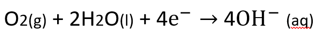 در بخش کاتدی فرآیند,مولکول های اکسیژن, الکترون های تولید شده از اکسایش آهن را از طریق مولکول های آب جذب می کنند و به یون هیدروکسید(-OH) تبدیل می شوند.