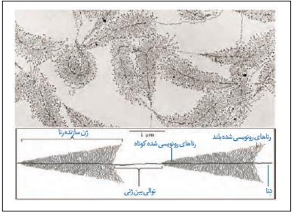 *شکل بالا، یک رشته مرکزی پررنگ تری دارد که این همان دنای ماست. بخش های منشعب آن مربوط به رنا هایی هستند که در حال رونویسی می باشند.