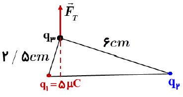 دو ذره باردار q1 و q2 مطابق شکل زیر قرار دارند . نیروی الکتریکی خالص ناشی از دو ذره به ذره بارداد q3 برابر F است. q2 چند میکروکولن است ؟