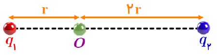 مطابق شکل زیر دو ذره باردار q1 = -2q و q2 = 6q در فاصله 3r از هم قرار دارند و بزرگی میدان الکتریکی خالص ناشی از دو ذره در نقطه O برابر E1 است . اگر 50 درصد از q2 به q1 منتقل شود ، بزرگی میدان الکتریکی خالص در نقطه O برابر E2 می شود نسبت E2 به E1 کدام است ؟