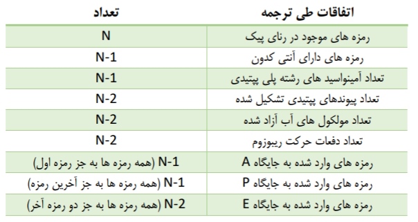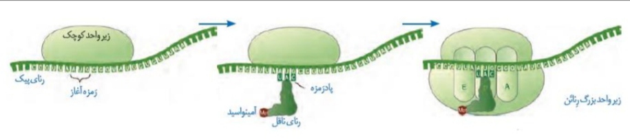 *در ارتباط با نکته قبل دقت کنید که ابتدا رنای ناقل فاقد آمینواسید از جایگاه E خارج می شود، سپس رنای ناقل حاوی آمینواسید وارد جایگاه A می شود!