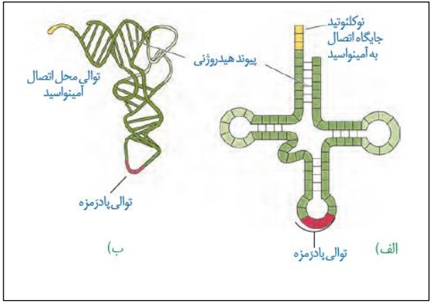 *شکل الف) این شکل تاخوردگی اولیه رنای ناقل را نشان می دهد. در واقع تشکیل پیوند هیدروژنی بین بخش های خاصی از رنای ناقل، سبب تاخوردگی اولیه می شود.