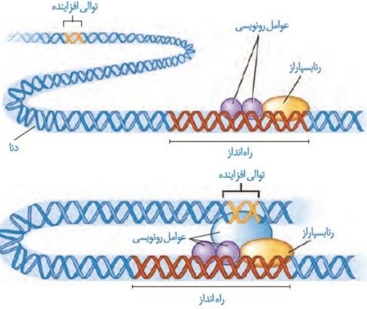 *در اثر اتصال عوامل رونویسی به توالی افزاینده، مولکول دنا خم می شود. با خم شدن مولکول دنا، عوامل رونویسی متصل به راه انداز و توالی افزاینده در کنار یکدیگر قرار می گیرند که این موضوع سبب افزایش سرعت و مقدار رونویسی می شود.