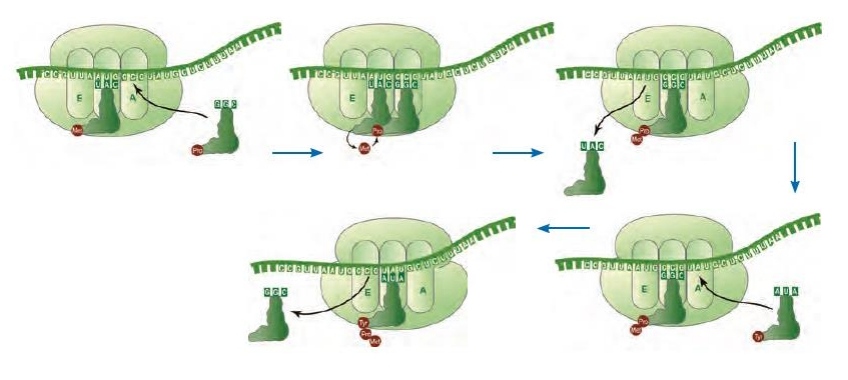 *دقت کنید بعد از حرکت اول، در حرکت های بعدی، رنای ناقل موجود بعد از دادن آمینواسید خود و واردشدن به جایگاه E، از طریق این جایگاه، رنای ناقل را ترک می کند.