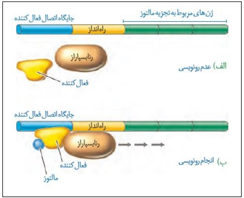 *دقت کنید مالتوز همانند لاکتوز مستقیما به دنا متصل نمی شود. لاکتوز به پروتئین مهار کننده و مالتوز به پروتئین فعال کننده متصل می شود.