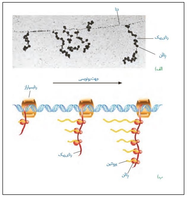 *شکل الف نشان دهنده یک مولکول دنا می باشد که همزمان چندین رنابسپاراز در حال رونویسی و ایجاد رنای پیک هستند. روی این رنای پیک به طور همزمان، چندین ریبوزوم در حال ترجمه دیده می شود.