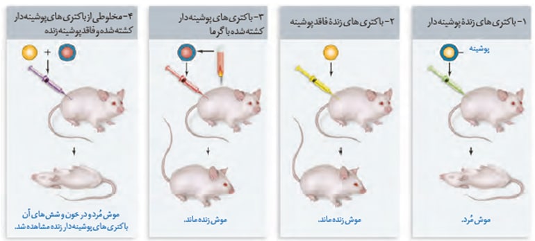 *آزمایش اول: در این مرحله، باکتری های زنده پوشینه دار به موش تزریق شد. در نتیجه، علائم بیماری بروز کرد و موش ها دچار سینه پهلو شدند و در نهایت مردند.