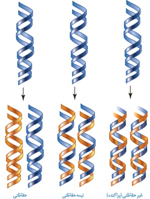 *همانندسازی غیرحفاظتی:در این طرح، قطعاتی بین رشته های دنای اولیه و دنای ساخته شده جا به جا می شوند و در هر رشته، هم قطعاتی قدیمی و هم جدید دیده می شود.