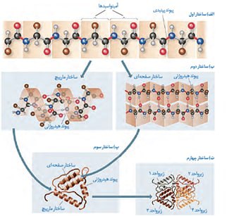 *ساختار پروتئین ها در 4 سطح مورد بررسی قرار می گیرد که در شکل مقابل نشان داده شده است.
