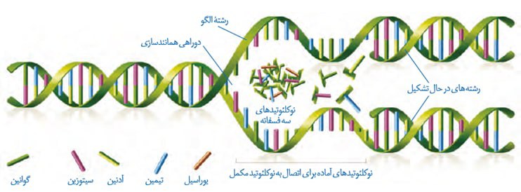 *دقت کنید در محل همانندسازی نوکلئوتید های دارای باز آدنین، تیمین، سیتوزین، گوانین و یوراسیل موجود می باشند اما فقط 4 تای اول به کار می روند. پس می توان گفت لزوما همه نوکلئوتیدهای موجود در محل همانندسازی مورد استفاده قرار نمی گیرند.